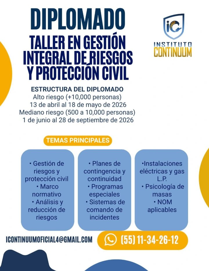 Hoy a las 17:00 horas inicia el Diplomado -Taller en Gestión Integral de Riesgos y Protección Civil, en el INSTITUTO CONTINUUM.