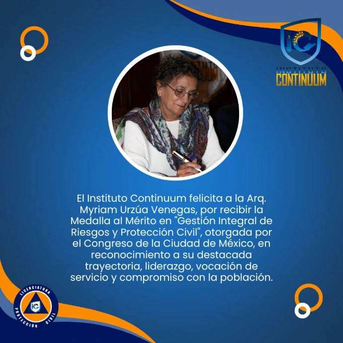 El INSTITUTO CONTINUUM felicita a la Arq. Myriam Urzúa Venegas, Titular de la Secretaría de Gestión Integral de Riesgos y Protección Civil, por recibir la "Medalla al Mérito en Gestión Integral de Riesgos y Protección Civil", que otorga el Congreso de la Ciudad de México.